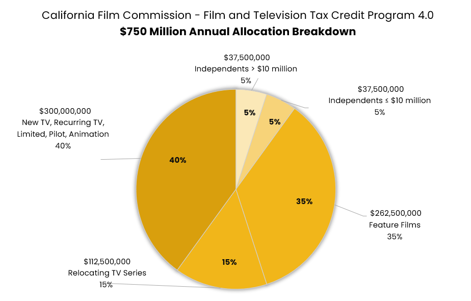 The California Film Commission administers the Film & Television Tax Credit Program 4.0 which provides tax credits based on qualified expenditures for eligible productions that are produced in California. The $3.75 billion program runs for 5 years, with a sunset date of June 30, 2030. Each fiscal year – July 1 to June 30 – the $750-million funding is categorized in: TV Projects, Relocating TV, Indie Features, and Non-Indie Features.